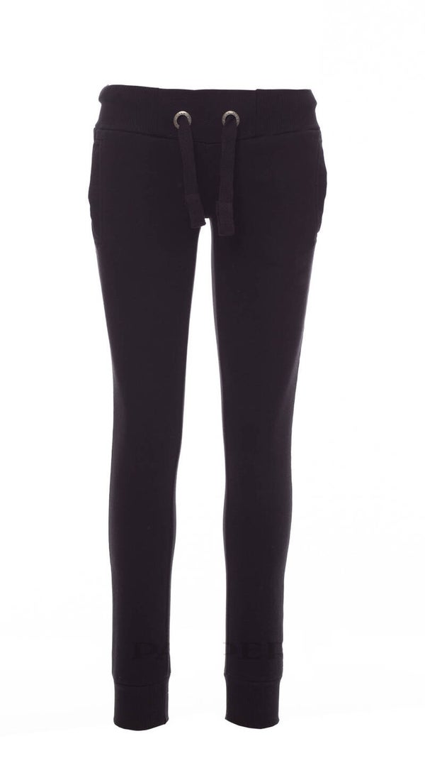 2)Pantalon en sweat pour femme avec bord côtes élastique à la taille et au bas des jambes, coulisse avec cordon blanc à coutures en contraste et anneaux en métal, deux poches devant avec bord côtes et coutures renforcées. 70% COTON 30% POLYESTER: 22€